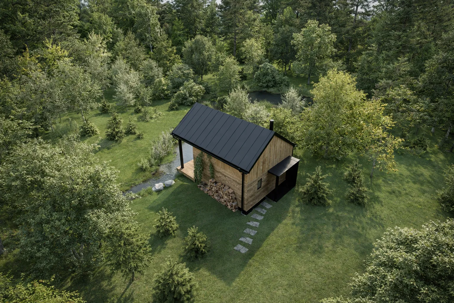 Náš klient toužil po jednoduchém konceptu minimalistické chaty, která by měla tradiční typologii, ale ve které bychom použili moderní prvky jako velká prosklená okna nebo dřevěný obklad. Další zásadní přání spočívalo v maximálním propojení s exteriérem, a tak jsme chatu doplnili o zastřešenou terasu. Výslednou dispozici jsme rozdělili na kuchyňský kout, do kterého se vchází krytým vstupem přes předsíň, a dále jídelní a obývací část. Vše dohromady spojují kamna, která rovnoměrně vytápí celý prostor. Vše doplňuje malá koupelna s wc a schodiště do patra, kde mají majitelé útulnou podkrovní ložnici s krásným výhledem do okolí. Celý objekt jsme na přání klienta také projektovali tak, aby se v budoucnu mohl dále rozšiřovat nebo propojovat. Snadno tak mohou vzniknout větší prostory pro více osob, ať už pro osobní rekreaci nebo k pronájmu.