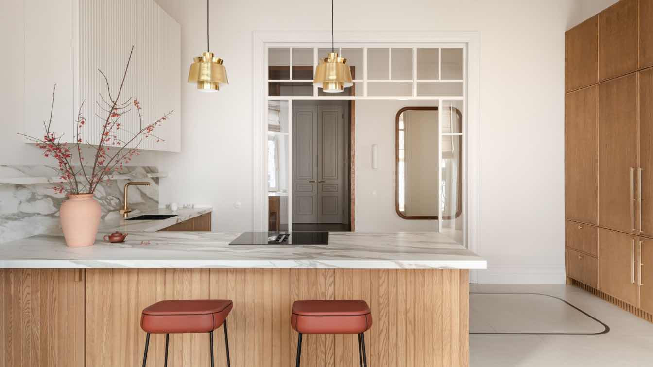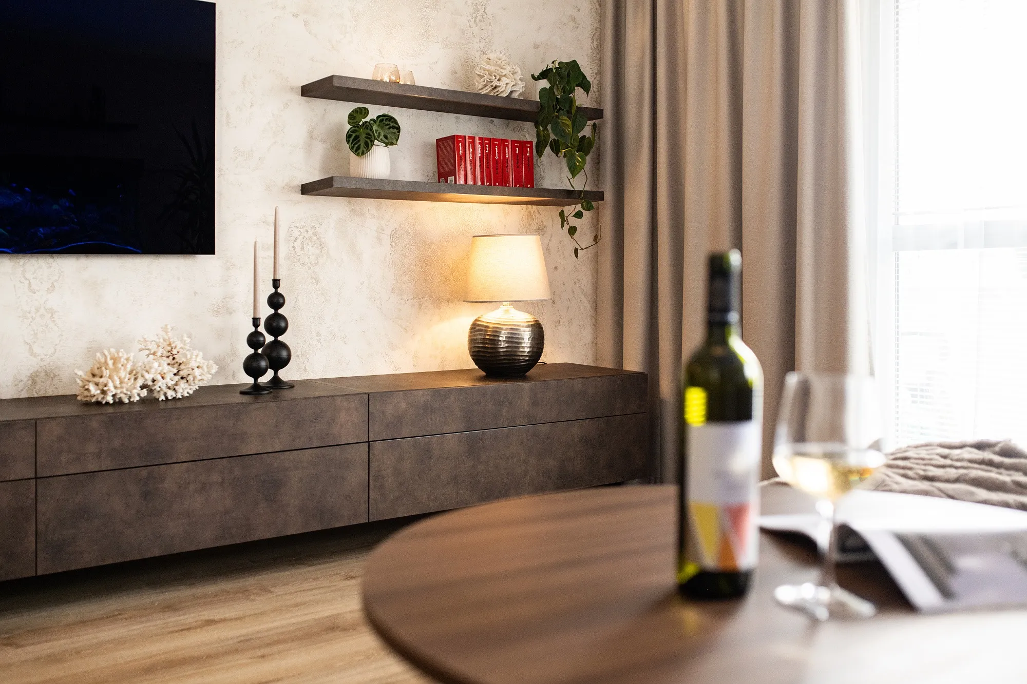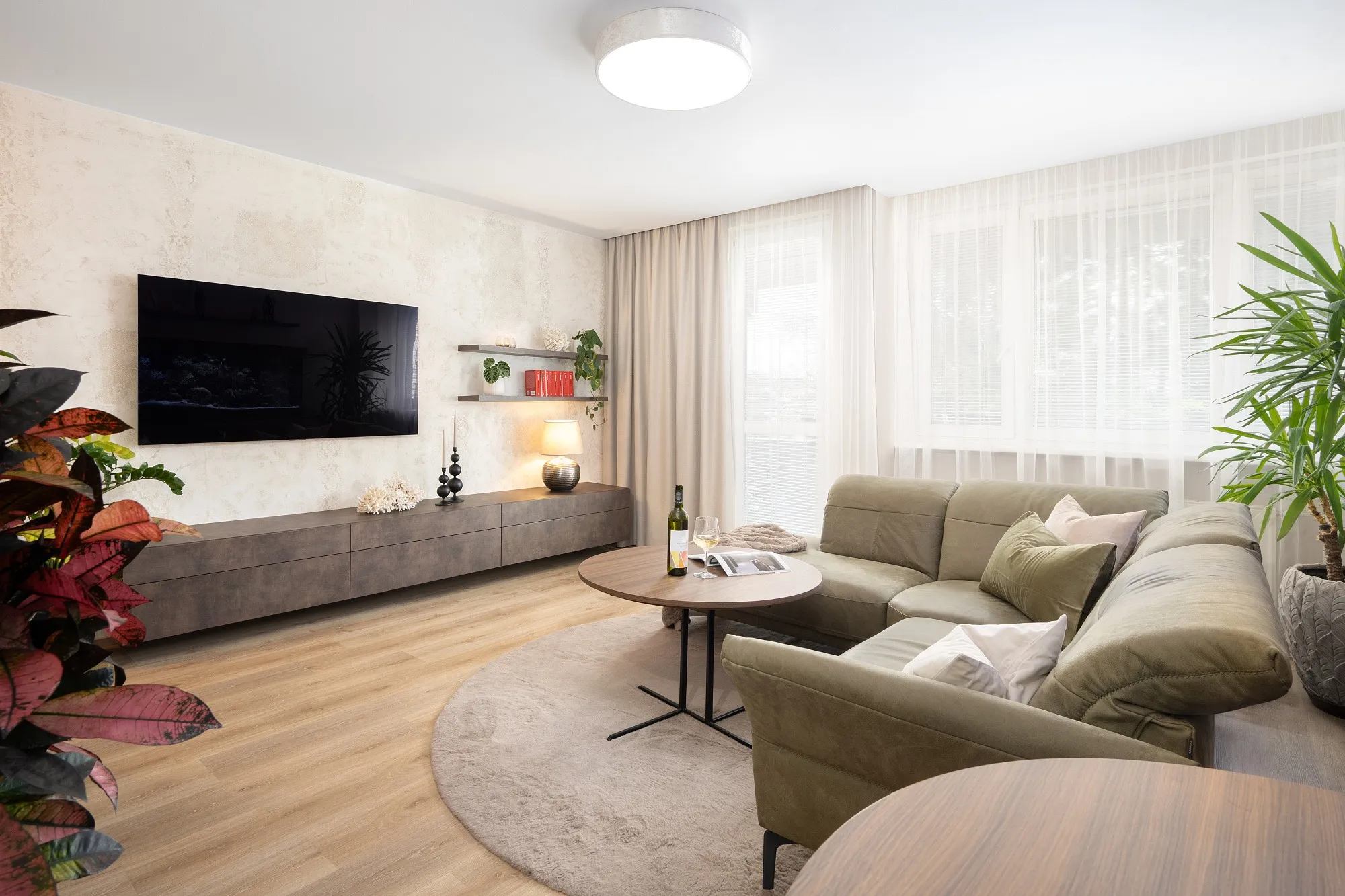 Na přání klienta zůstala v obývacím pokoji zachována původní stěrka na stěnách i podlaha v dekoru dřeva, od kterých se odvíjí barevné schéma celého interiéru. Klient si přál nadčasový prostor laděný do zemitých tónů, s důrazem na praktičnost a funkčnost.
