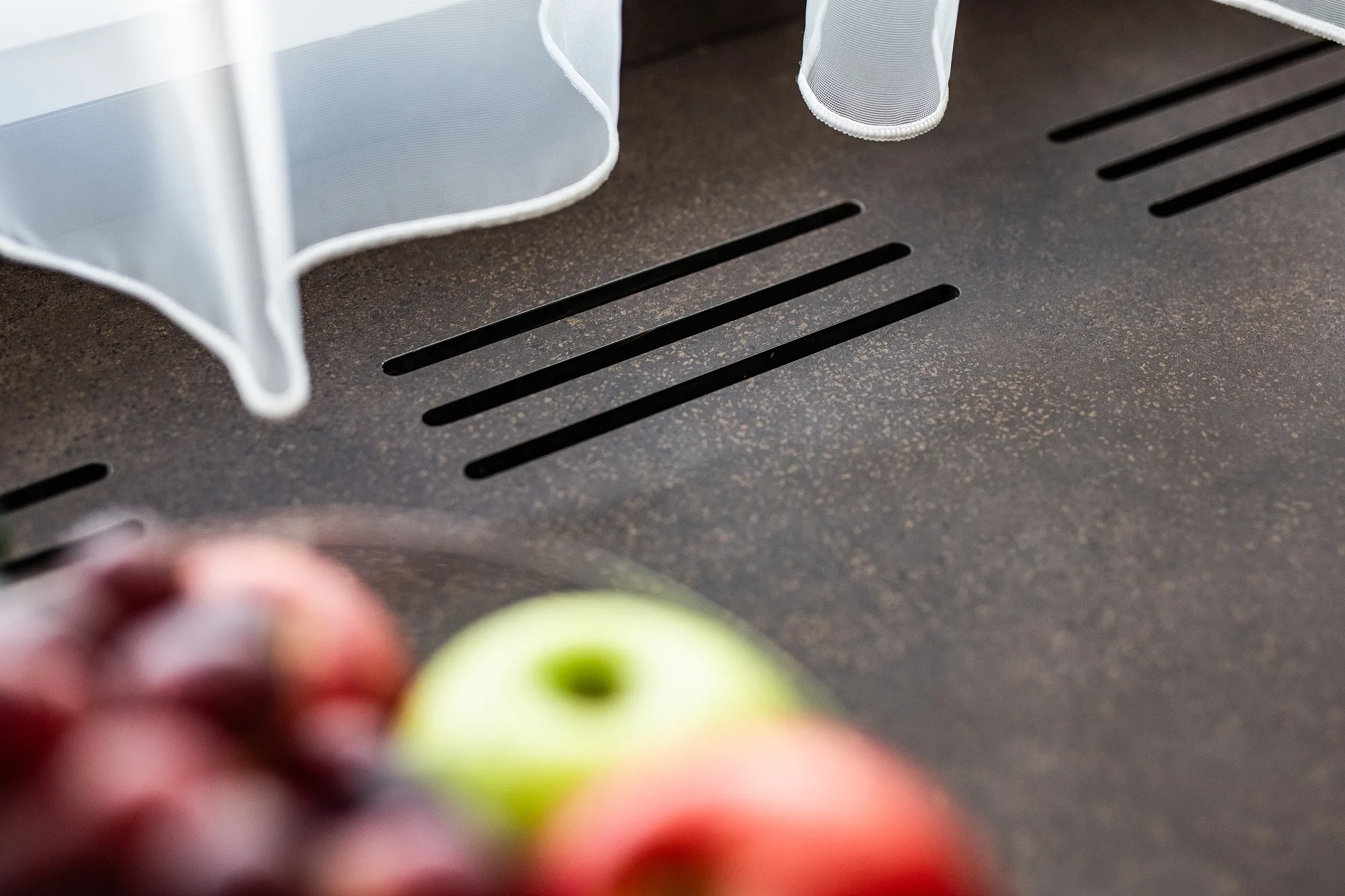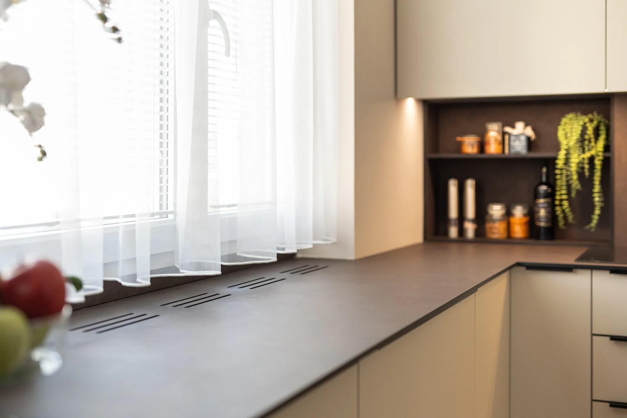 Kuchyňská linka je vyrobena z lakované MDF s „bezotiskovou“ povrchovou úpravou, která je nejen elegantní, ale i praktická na údržbu. Pracovní deska z kompaktního materiálu dodává celku potřebnou odolnost a styl.