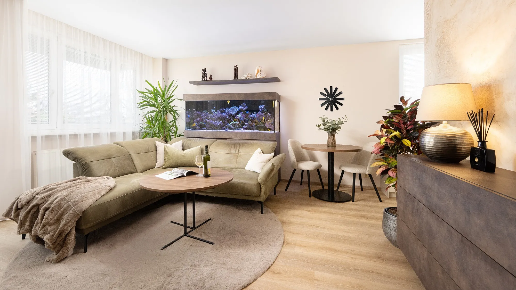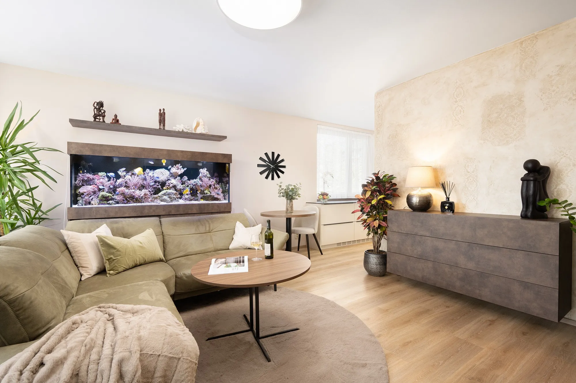 Srdcem interiéru je bezesporu mořské akvárium – nejen vizuálně poutavý prvek, ale i odraz klientovy vášně. Vzhledem k tomu, že v bytě žije sám, nebyla potřeba velkého jídelního stolu. Místo něj jsme zvolili prostornou sedačku a vyvýšený konferenční stolek, ideální pro práci i relax.