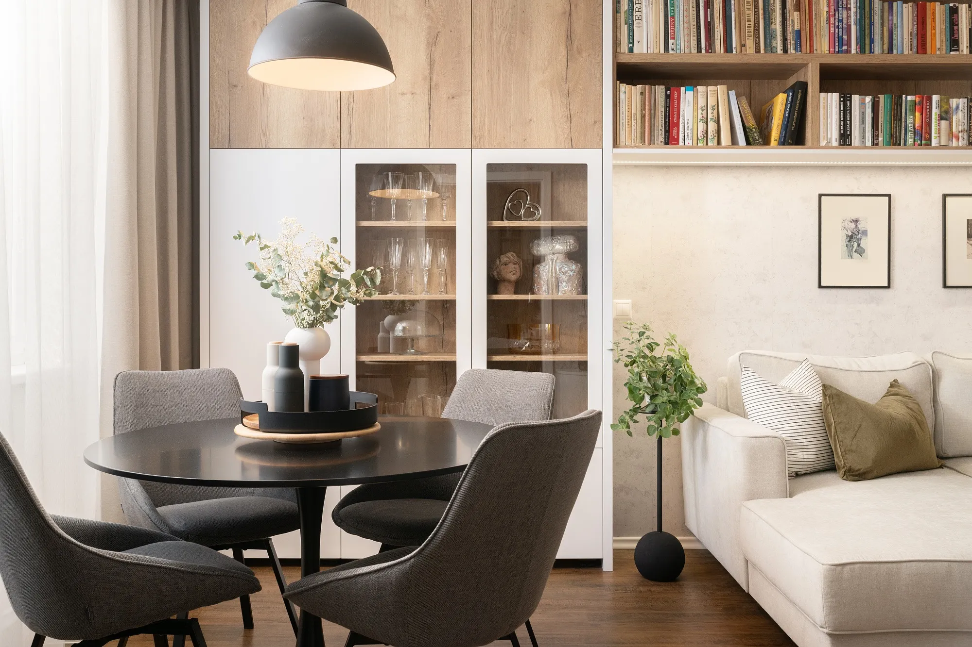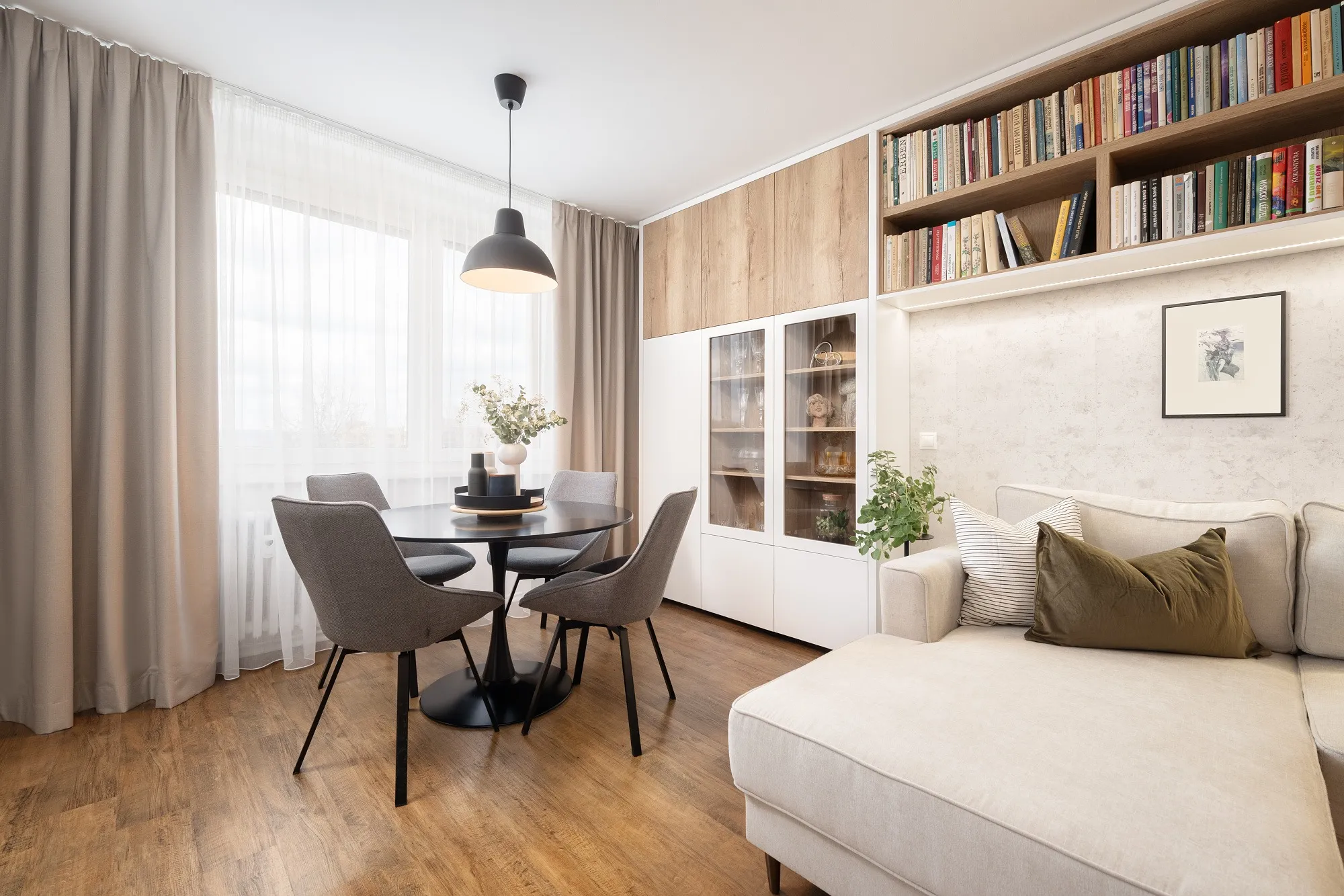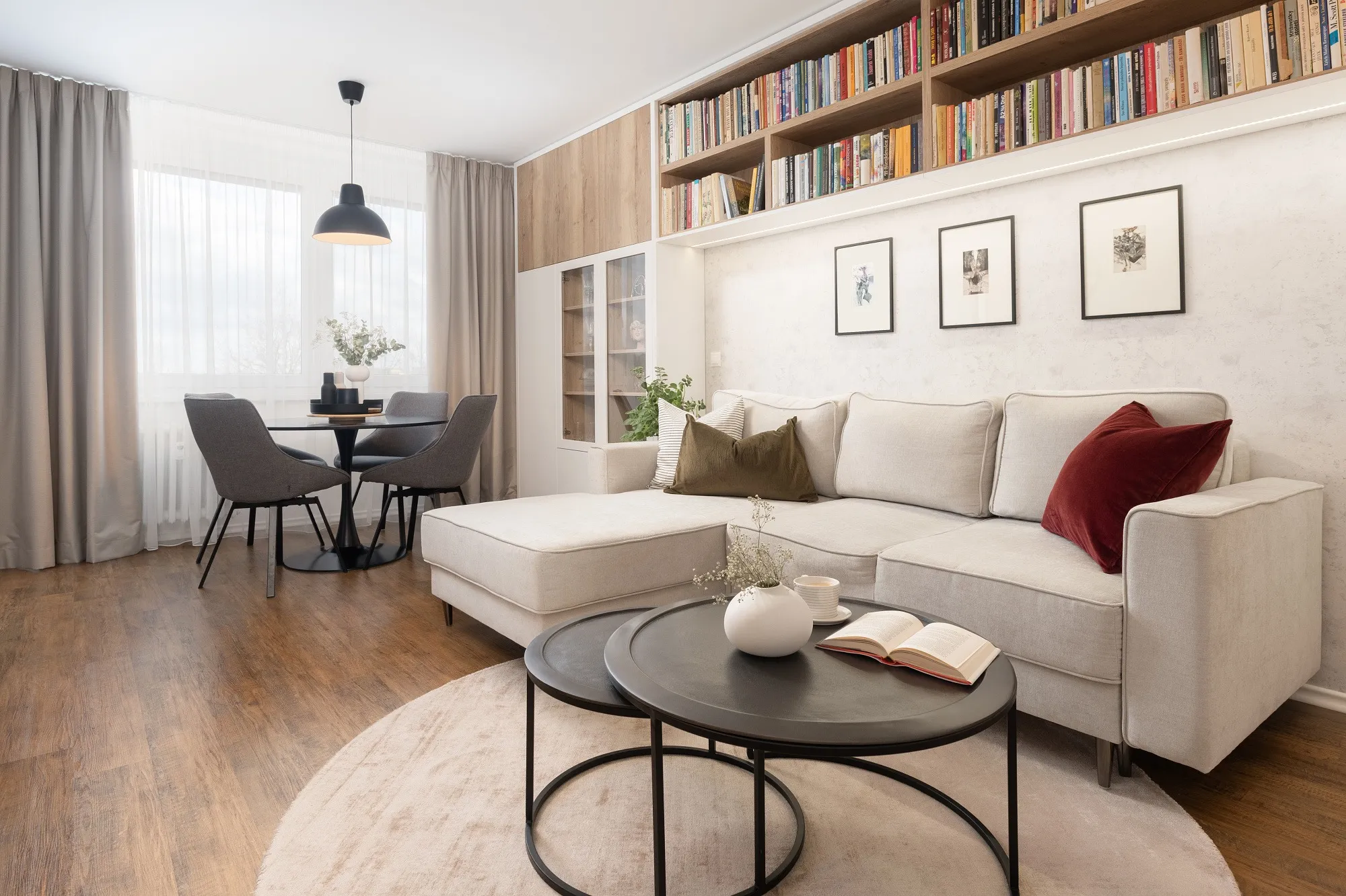 Interiér obývacího pokoje byl vytvořen pro dámu, která v bytě bydlí sama. Bez obav jsme se tak mohly pustit do světlých tónů. Opustily jsme zažitý úzus vertikálně postavěné knihovny a v rámci prostorových úspor jsme ji vhodně situovaly pod strop. Tomuto ne úplně lehce přístupnému prostoru se tak dostalo smysluplného využití. Do zorného úhlu majitelky i ostatních návštěvníků jsme dle přání zakomponovaly otevřené police. Pro setkávání s blízkými je možné využít jak jídelní stůl, na který v jiných částech bytu není místo, tak prostor se sedačkou a konferenčním stolkem. Použitý dřevodekor na nábytku byl vybrán na přání klientky.