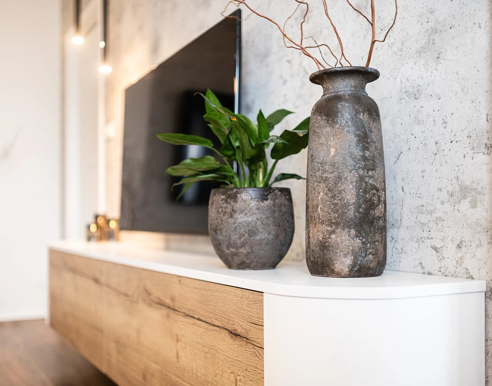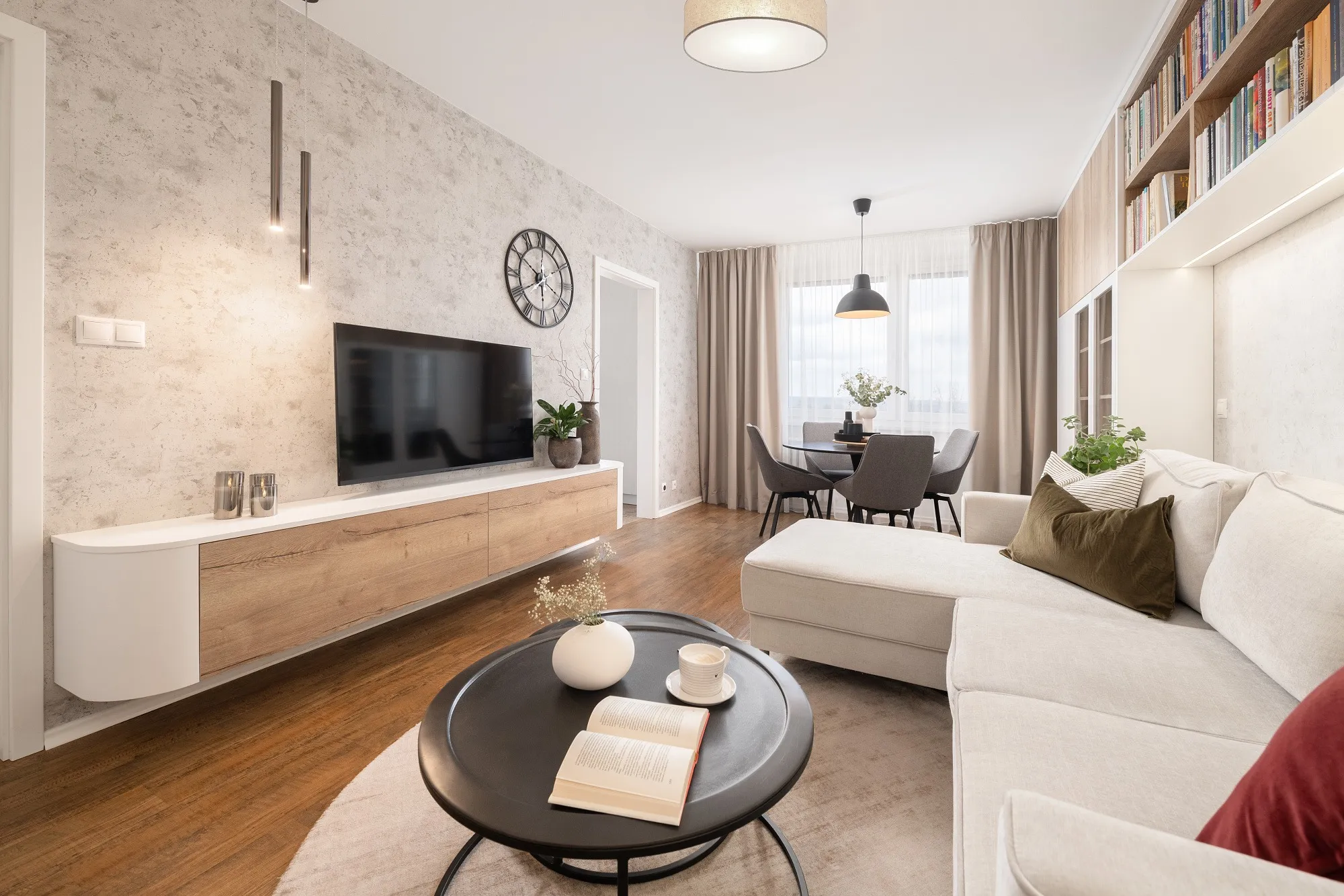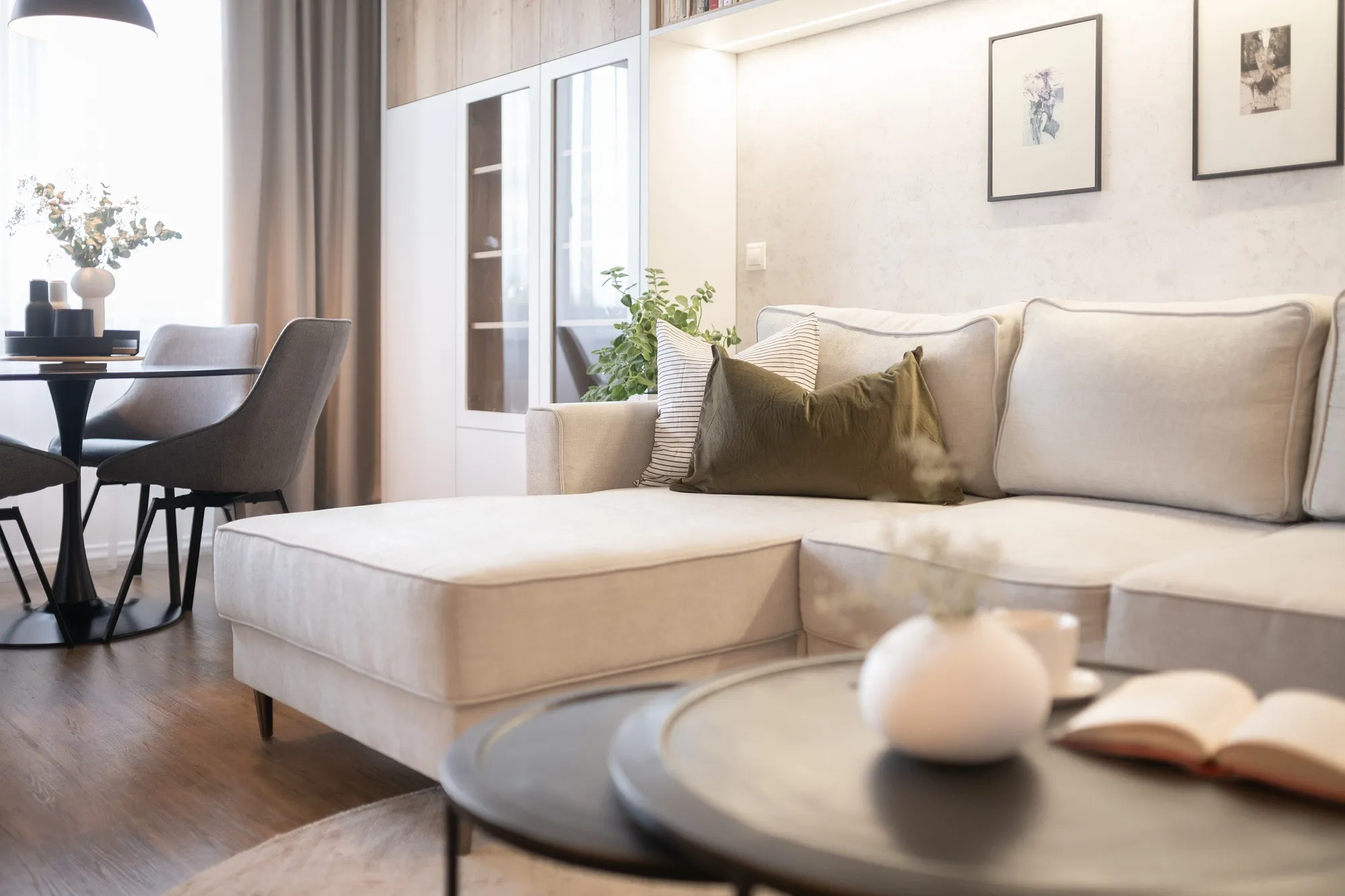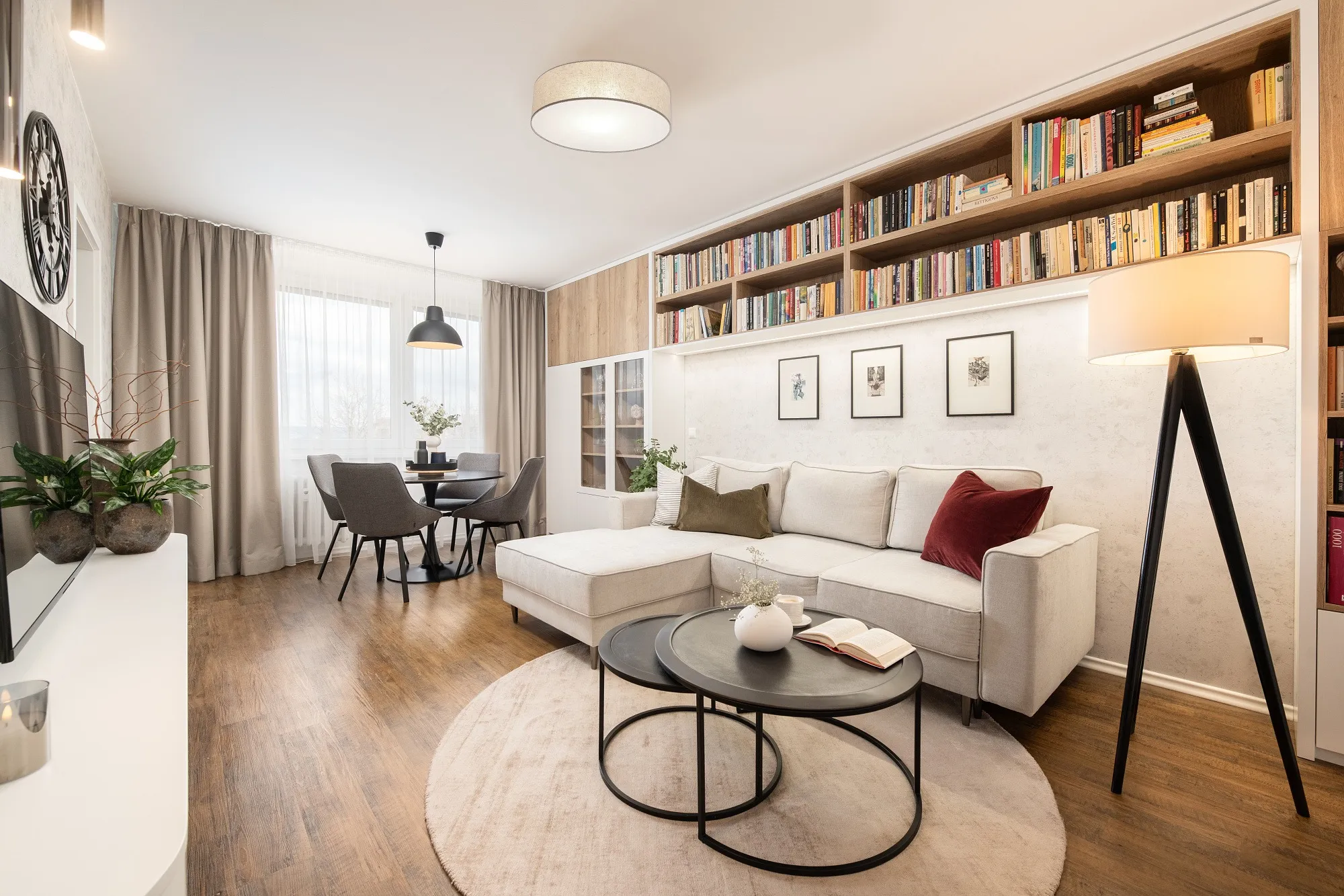 Interiér obývacího pokoje byl vytvořen pro dámu, která v bytě bydlí sama. Bez obav jsme se tak mohly pustit do světlých tónů. Opustily jsme zažitý úzus vertikálně postavěné knihovny a v rámci prostorových úspor jsme ji vhodně situovaly pod strop. Tomuto ne úplně lehce přístupnému prostoru se tak dostalo smysluplného využití. Do zorného úhlu majitelky i ostatních návštěvníků jsme dle přání zakomponovaly otevřené police. Pro setkávání s blízkými je možné využít jak jídelní stůl, na který v jiných částech bytu není místo, tak prostor se sedačkou a konferenčním stolkem. Použitý dřevodekor na nábytku byl vybrán na přání klientky.
