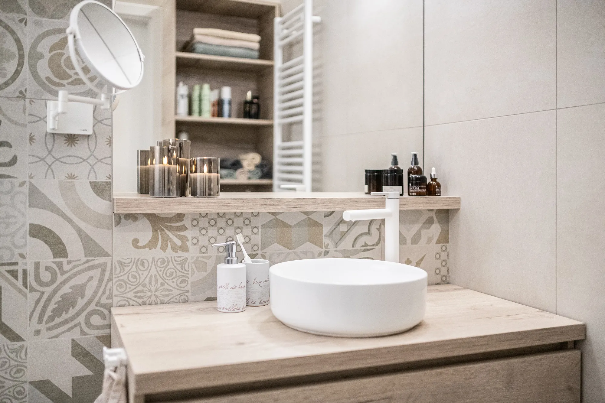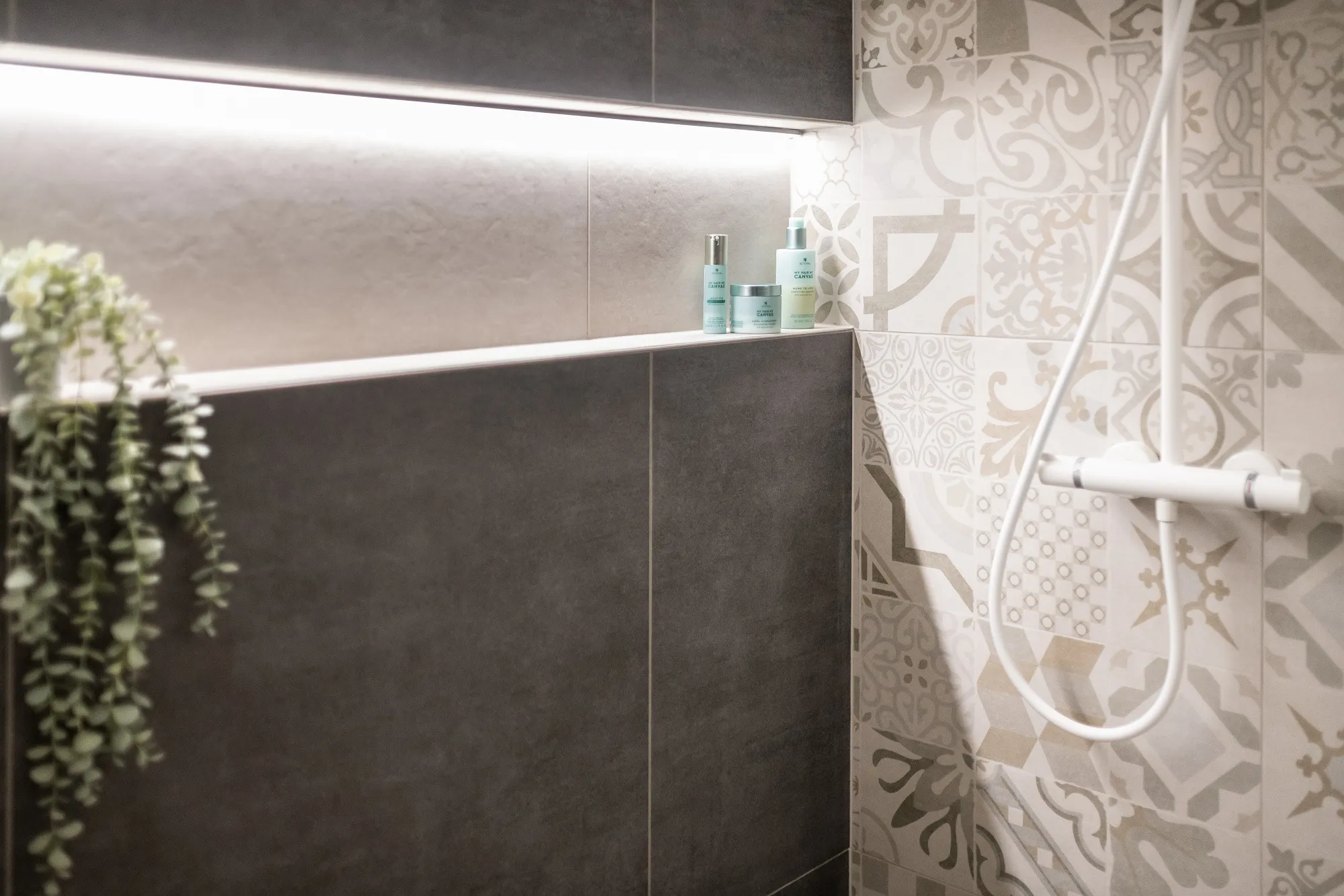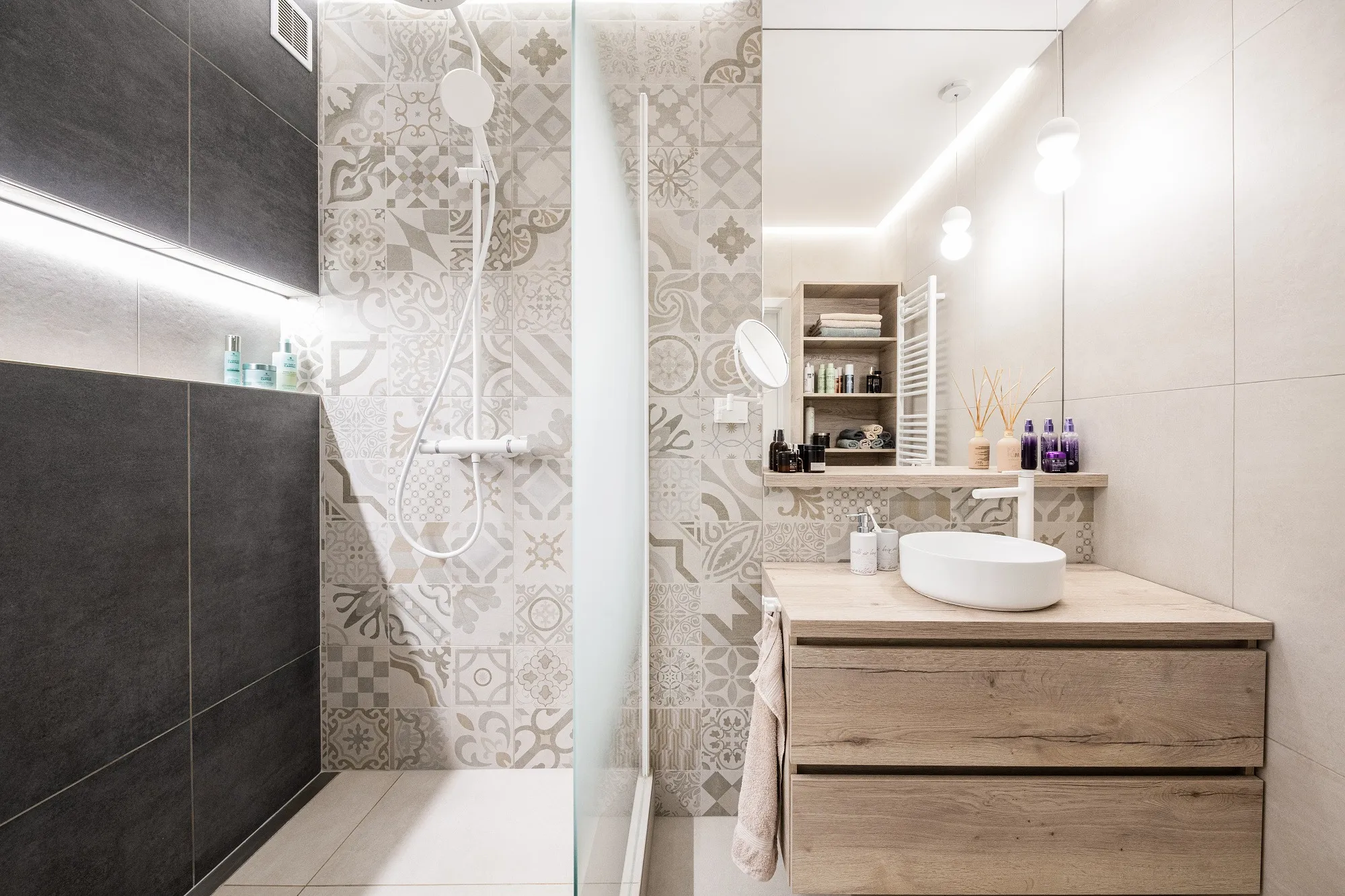 Stejný dekor jako v obývacím pokoji je použit i v koupelně, akorát ve světlejším odstínu. I přes nevhodné situační řešení se nám do koupelny povedl umístit prostorný sprchový kout se zástěnou walk-in, který byl rovněž velkým přáním paní Lucie.