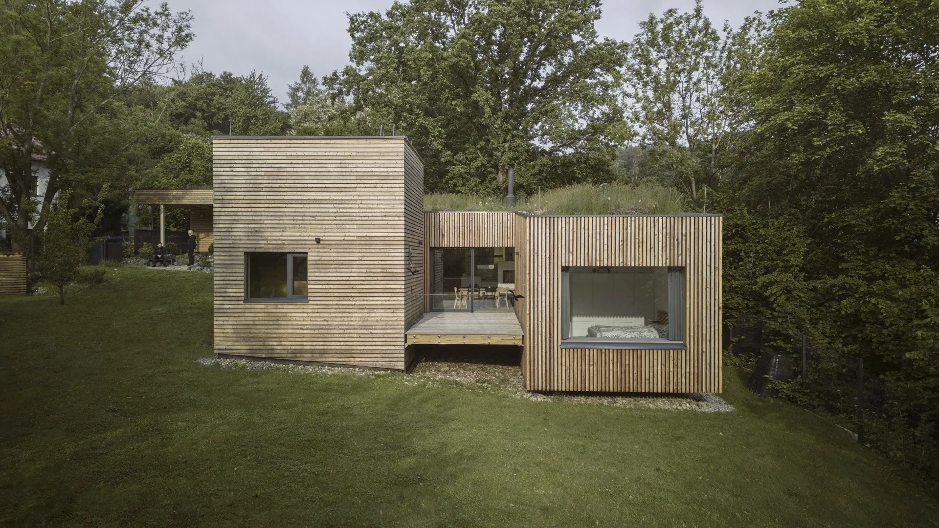 Vlaďka s Martinem si vysnili dům na víkendové pobyty mimo hektickou metropoli. Pozemek, který získali v rámci rodiny, byl ukrytý v zeleni, nedaleko lesa a ohraničen vzrostlými listnatými stromy. Od prvního konceptu jsme chtěli minimalizovat zásahy do území a být v souladu s okolní přírodou. To co jsme si z pozemku vzali přesouváme o úroveň výše na střechy, kde bují intenzivní zeleň. Střecha pomáhá udržet biodiverzitu a vizuálně objekt nechává splývat s okolím. Dřevěná fasáda přirozeně zestárne, získá jemnou stříbrnou patinu a dům se stane téměř neviditelným. Je součástí lesa. Svažitý terén určoval logiku celého návrhu. Na pozemku jsme navrhli tři solitérní hmoty. V jeho nejvyšším místě, kde je vstup, sedí garáž s krytým carportem. Hlavní dům je odsazen níže, dále od cesty. Jeho přízemní hmota sleduje terén pozemku. Tento rytmus rozdílných úrovní vytváří proměnlivou prostorovou kompozici. Uvnitř domu jsou vloženy celkem čtyři výškové úrovně mezi sebou propojené vyrovnávacími schody. Vstup do domu se zádveřím, obytný prostor s pracovnou, jídelna s kuchyní a krbem a v nejnižší úrovni ložnice s „window seat“, která levituje nad terénem. Na obytný prostor a jídelnu navazují venkovní dřevěné terasy. Celá kompozice graduje do vertikální hmoty, věže, ve které je finská sauna s ochlazovnou. Dá se používat nezávisle na hlavním domě a nabízí útulný prostor i pro hosty. Medvěd, vydra, liška, výtvarná díla od finského artisty Teemu Järviho dokreslují severský interiér. Náročný přístup na pozemek předurčil i samotnou realizaci domu, která vznikala technologií sbíjené dřevostavby z KVH smrkových profilů. Dům je primárně vytápěn tepelným čerpadlem vzduch-voda, sekundárně krbem na dřevo. Výměnu vzduchu zajišťuje centrální rekuperace. Pultovou střechu pokrývá intenzivní zeleň se zálivkou.