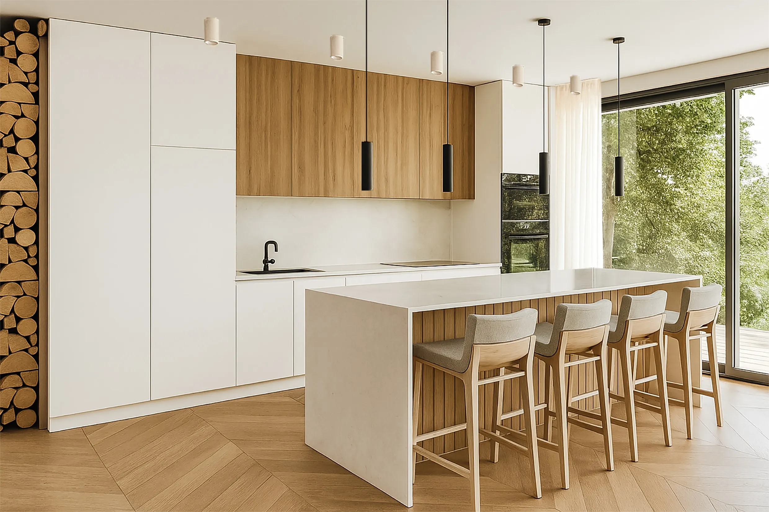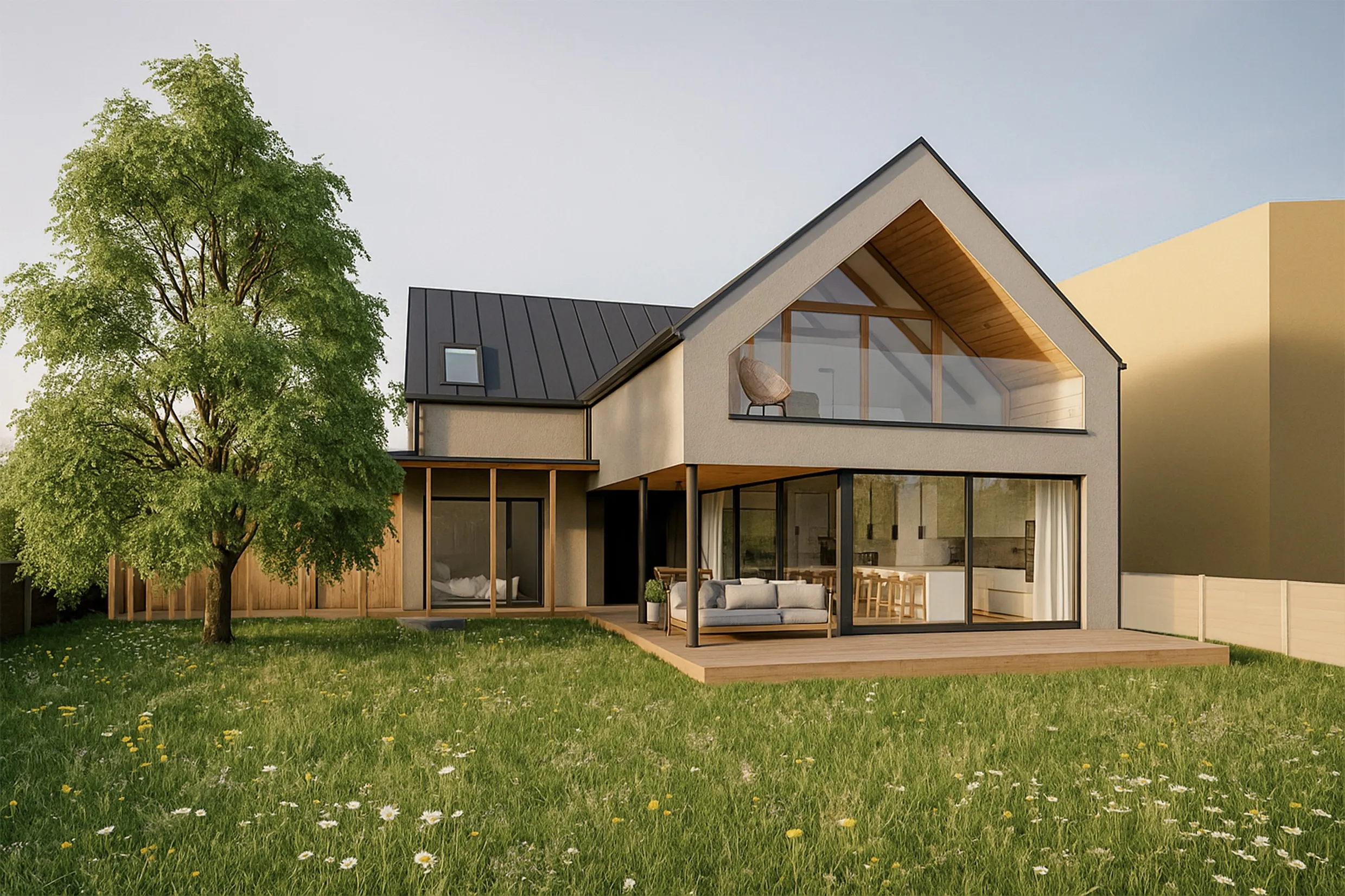 Novostavba rodinného domu (5+kk) kombinuje výhody moderní dřevostavby s tradiční sedlovou střechou. Srdcem domu je velkorysý obývací prostor s kuchyní a jídelnou v přízemí, který se díky velkoformátovým oknům plně otevírá do zahrady. Praktické zázemí zde doplňuje garáž, technická místnost, zádveří a koupelna. Podkroví slouží jako klidová zóna se dvěma dětskými pokoji, koupelnou, odděleným WC, šatnou a hlavní ložnicí. Z té vede přímý vstup na menší soukromou terasu s výhledem do zeleně. Celému interiéru vládne dřevo, které ve spojení se spoustou denního světla vytváří velmi útulnou a hřejivou atmosféru.