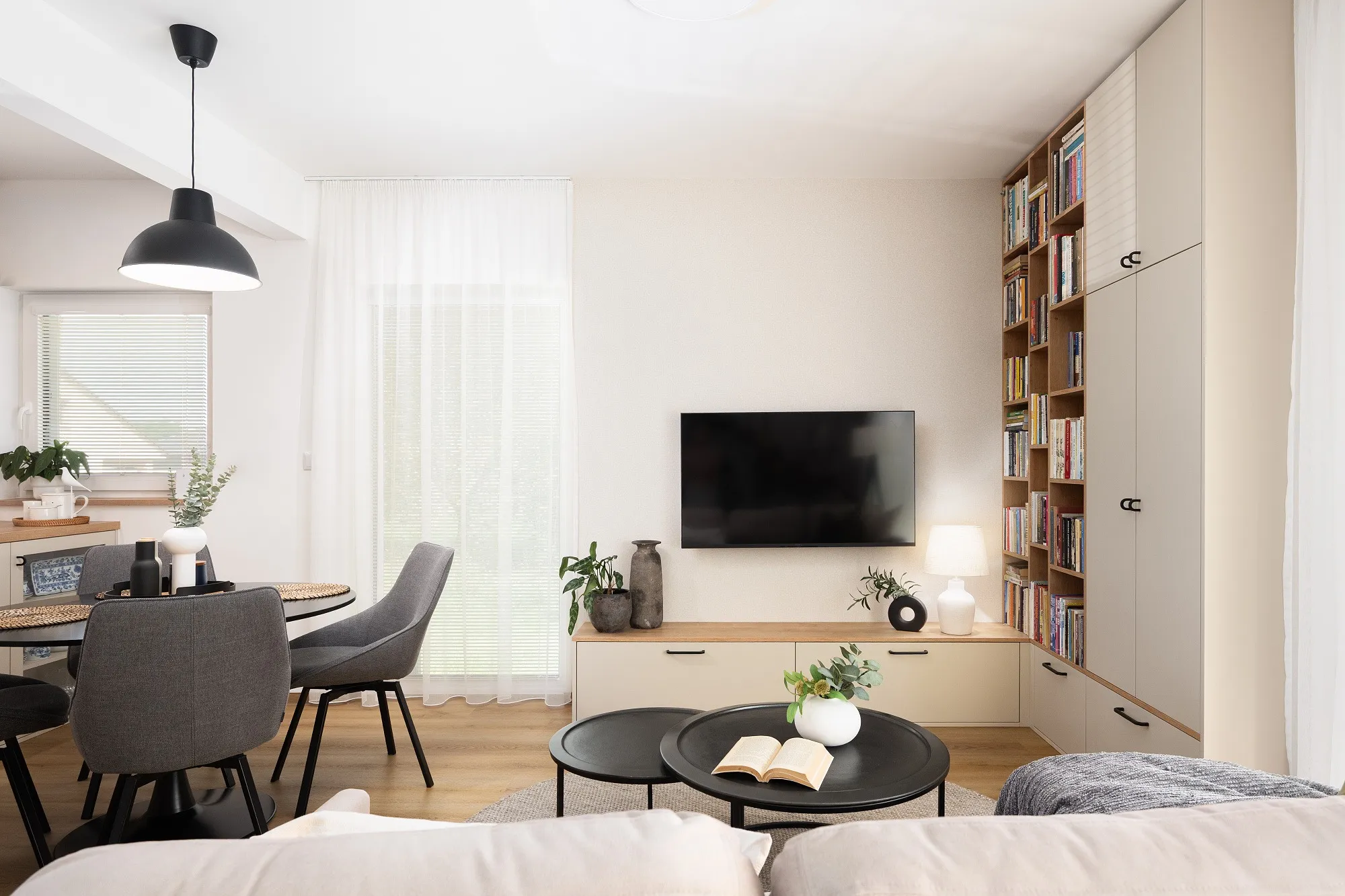 Styl interiéru navazuje na původní byt – znovu jsem využila některé oblíbené prvky, například jídelní stůl, židle, konferenční stolky i drobné doplňky. Výsledkem je útulný, nadčasový a světlý interiér, ve kterém se klientka cítí přirozeně a v pohodě.