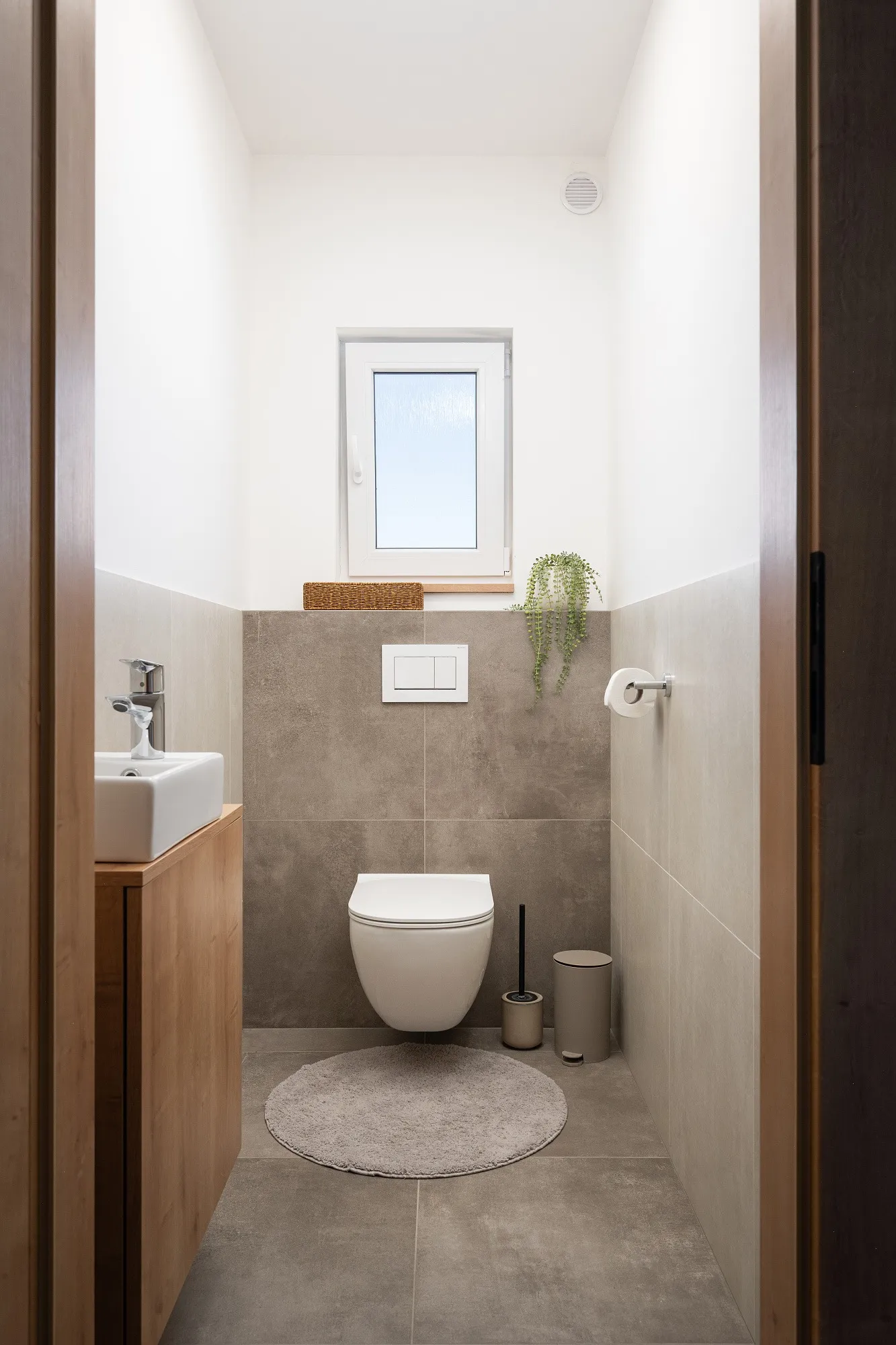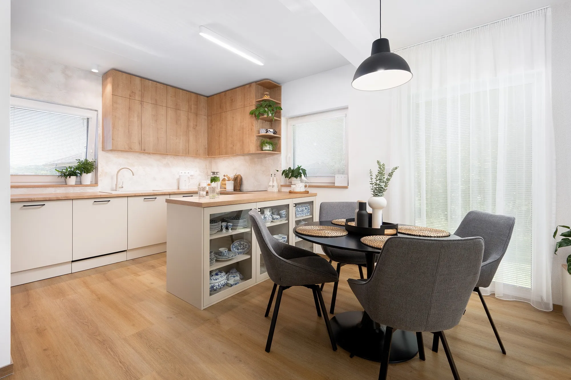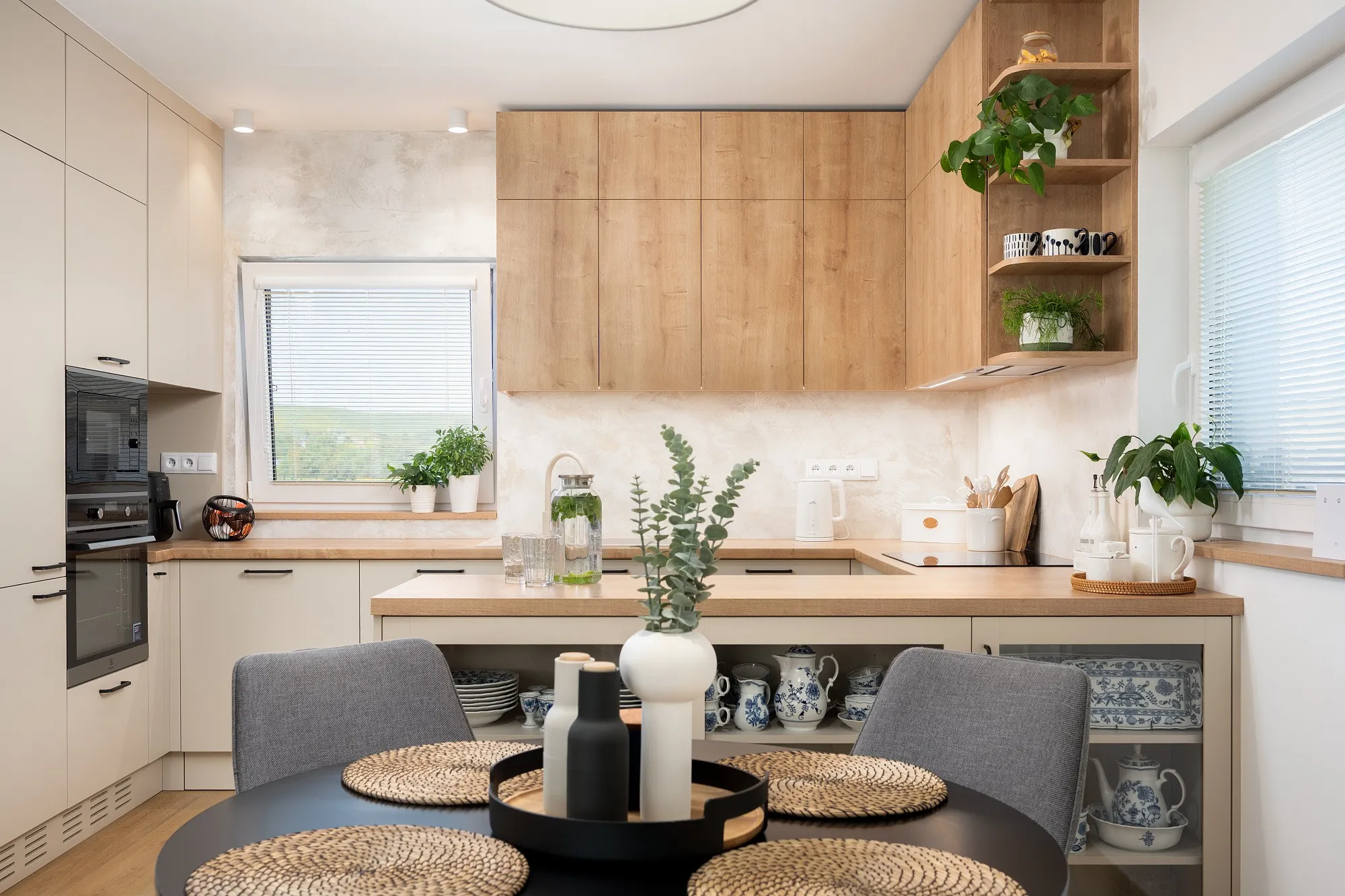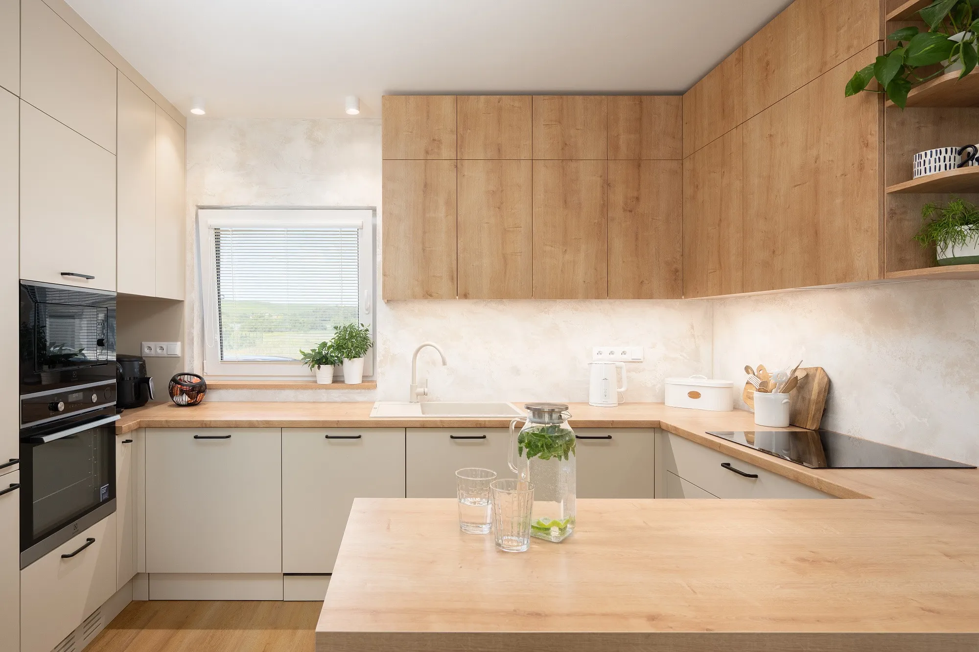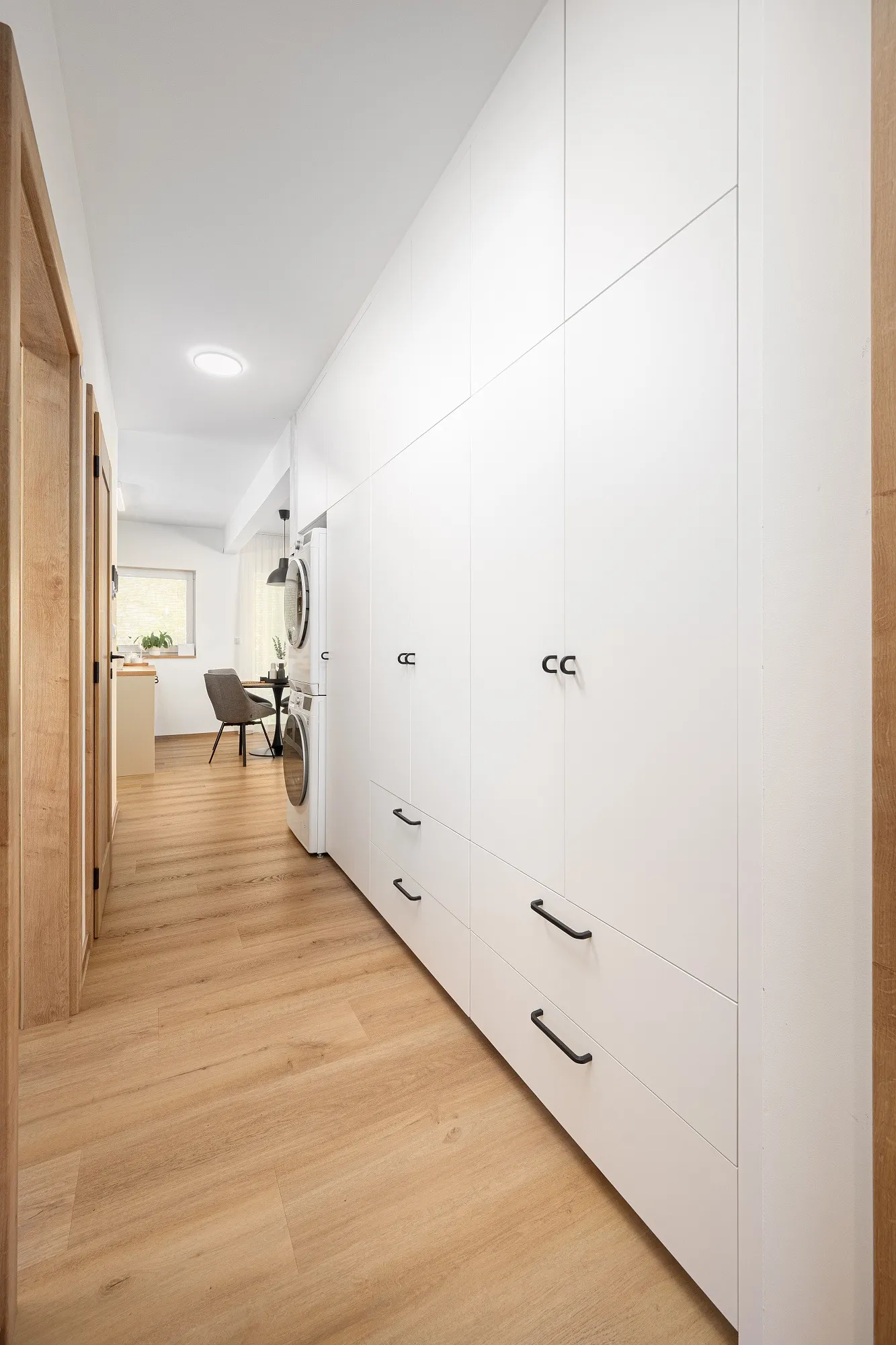 Spojovacím prvkem je dřevodekor použitý na nábytku i dveřích v kombinaci s dubovou vinylovou podlahou. Celkový vzhled zjemňují přírodní odstíny, textilní tapeta a jemná stěrka.