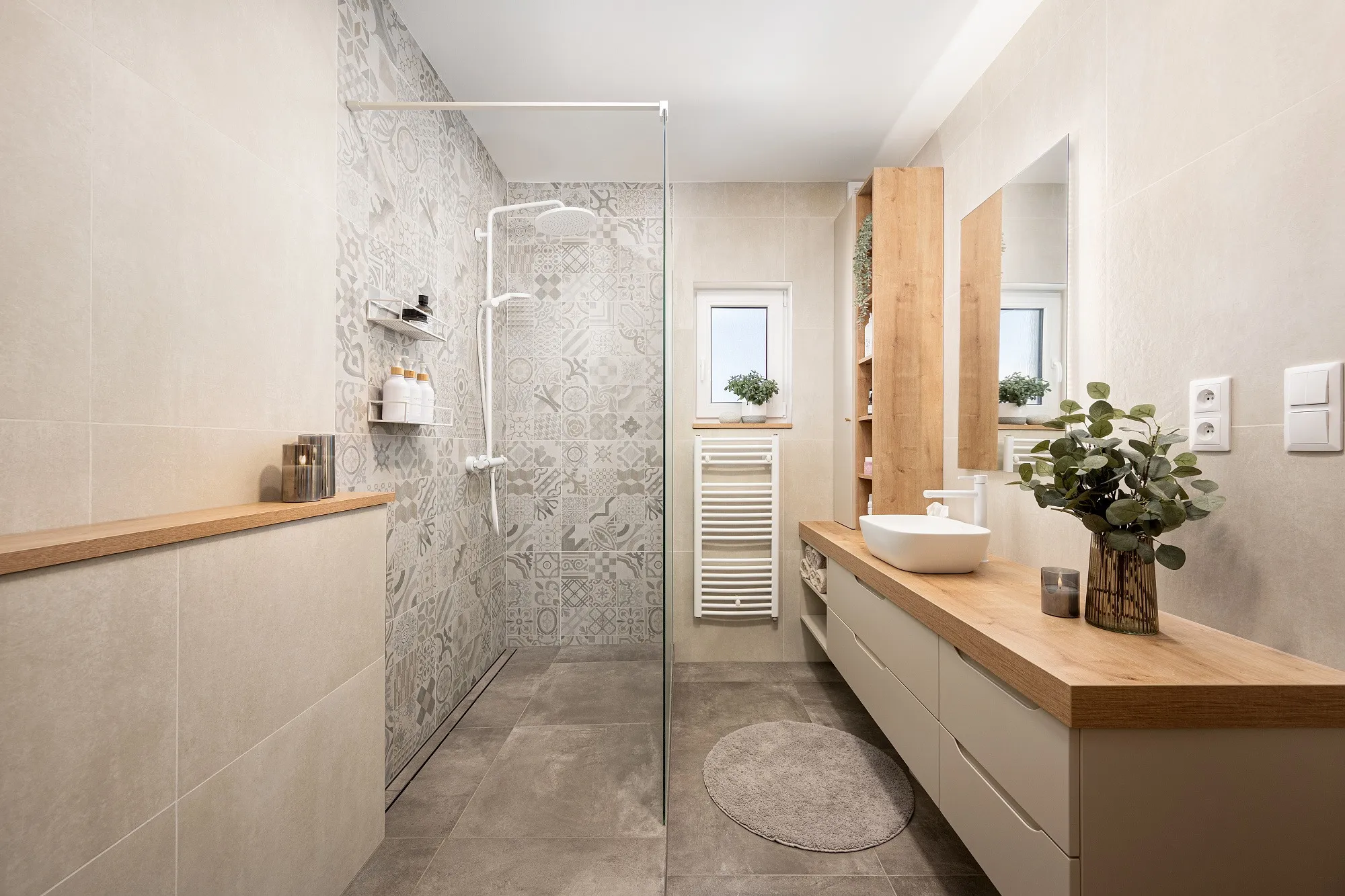 V koupelně jsme se vrátily k oblíbenému prvku z bytu – patchworkovému obkladu, který jí dodává pocit domova.