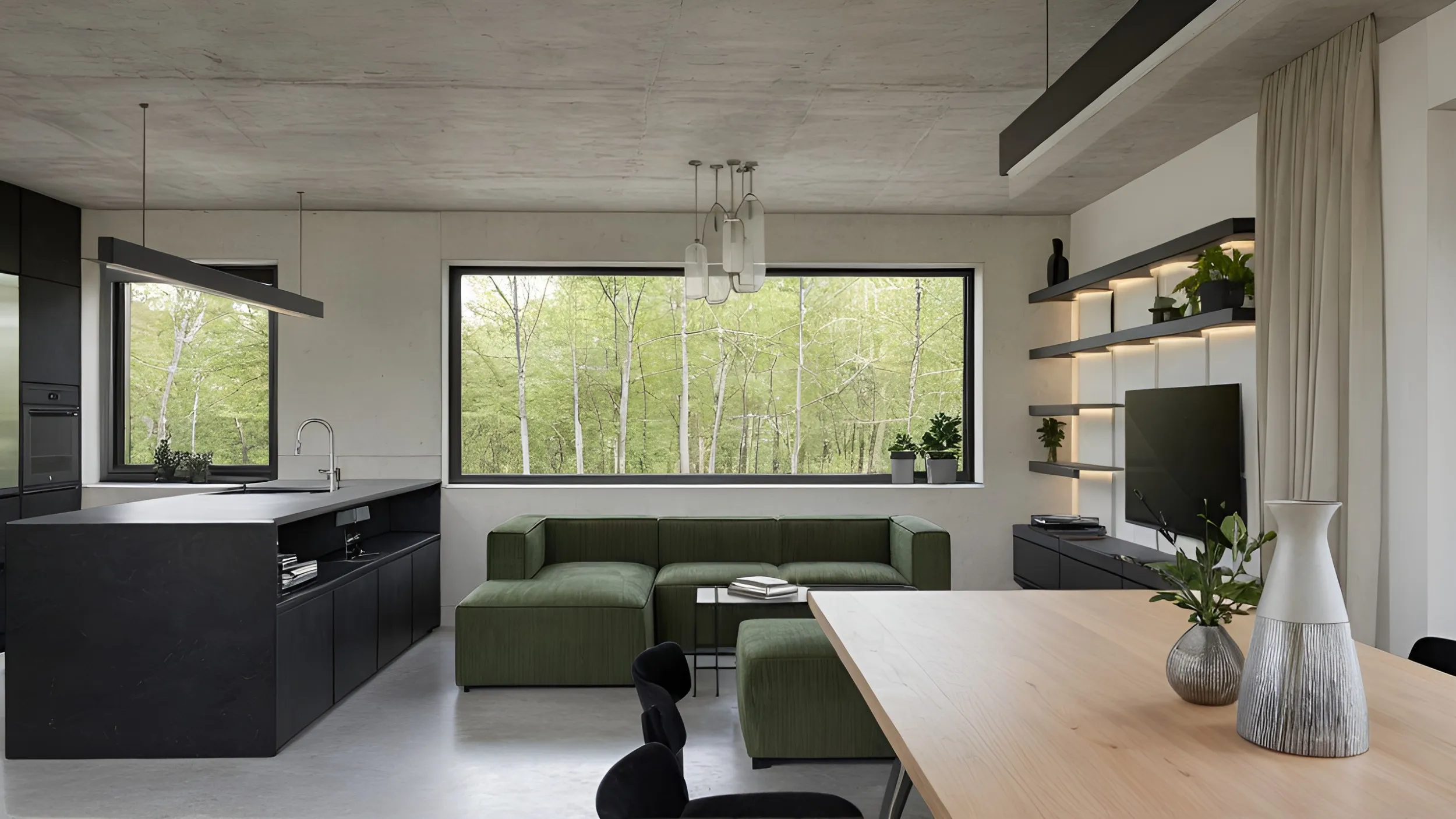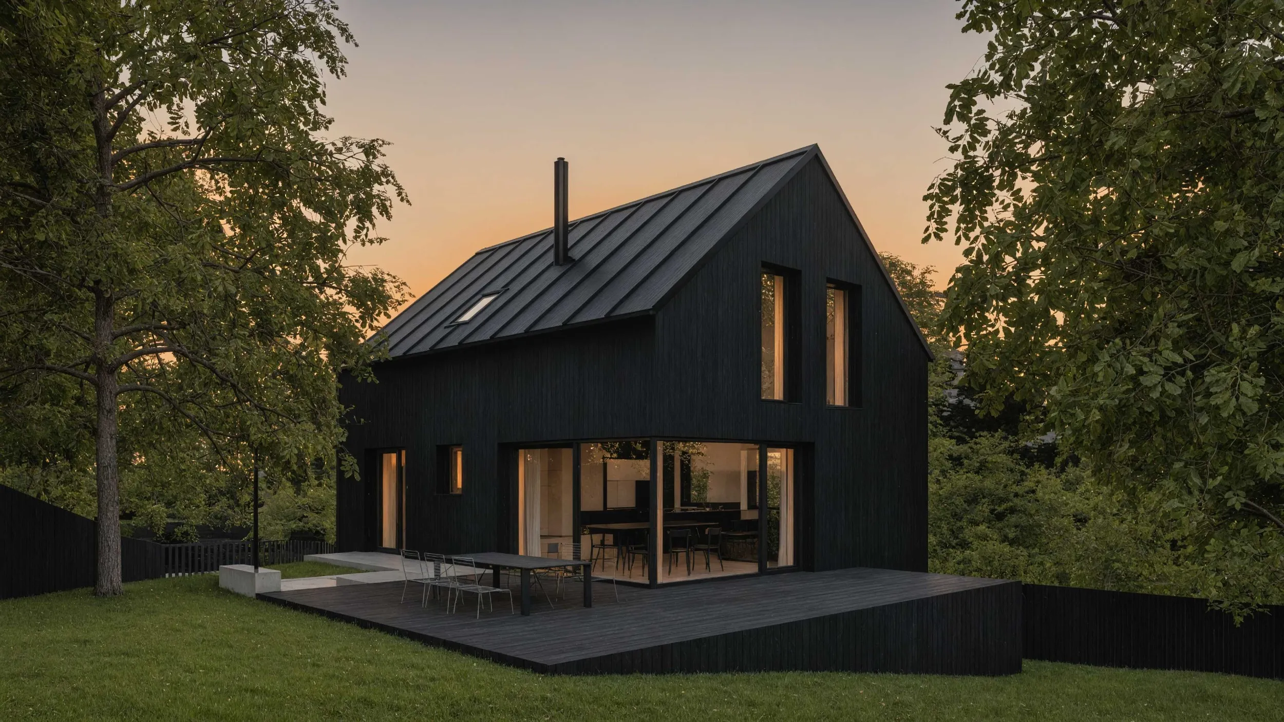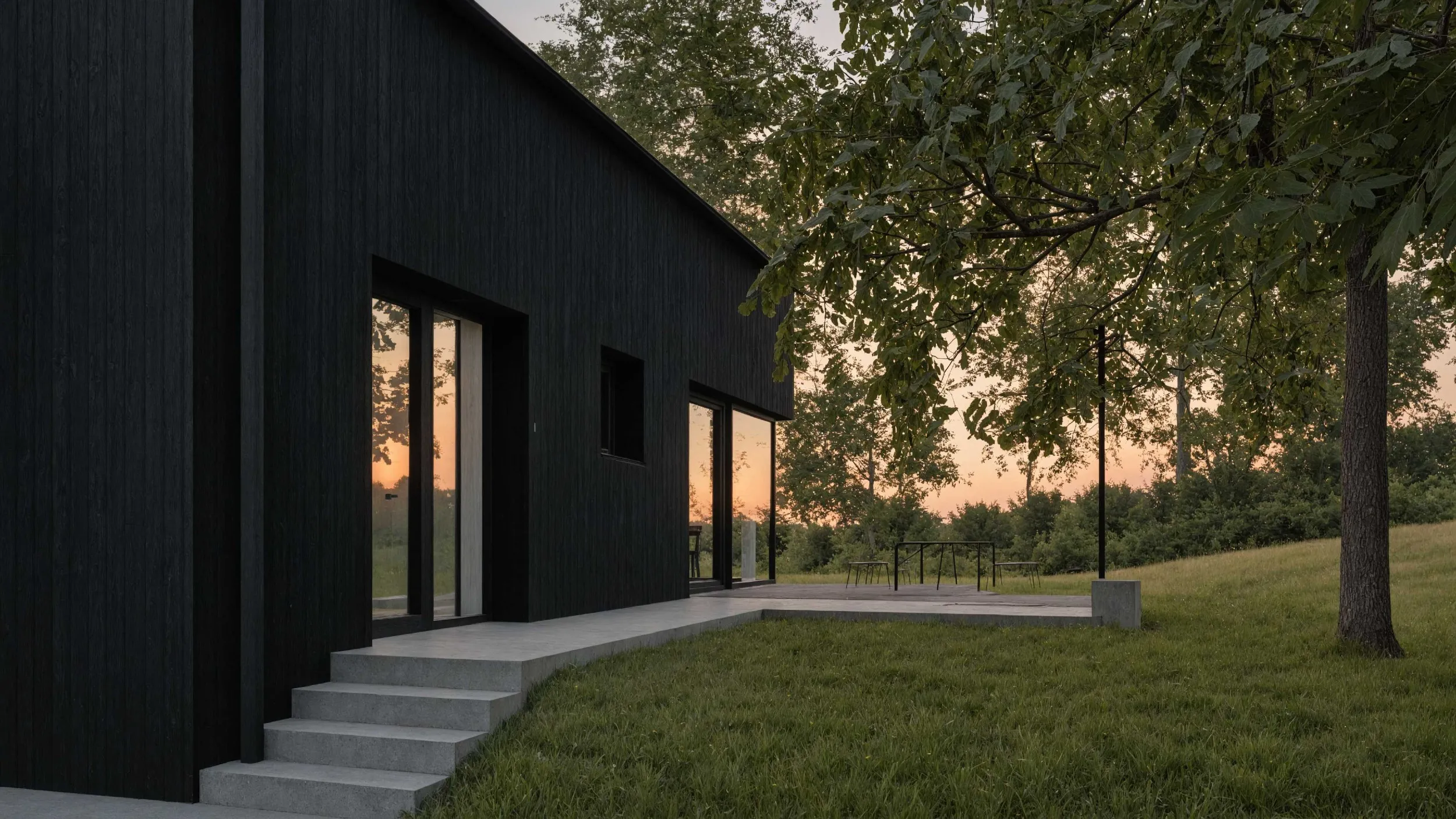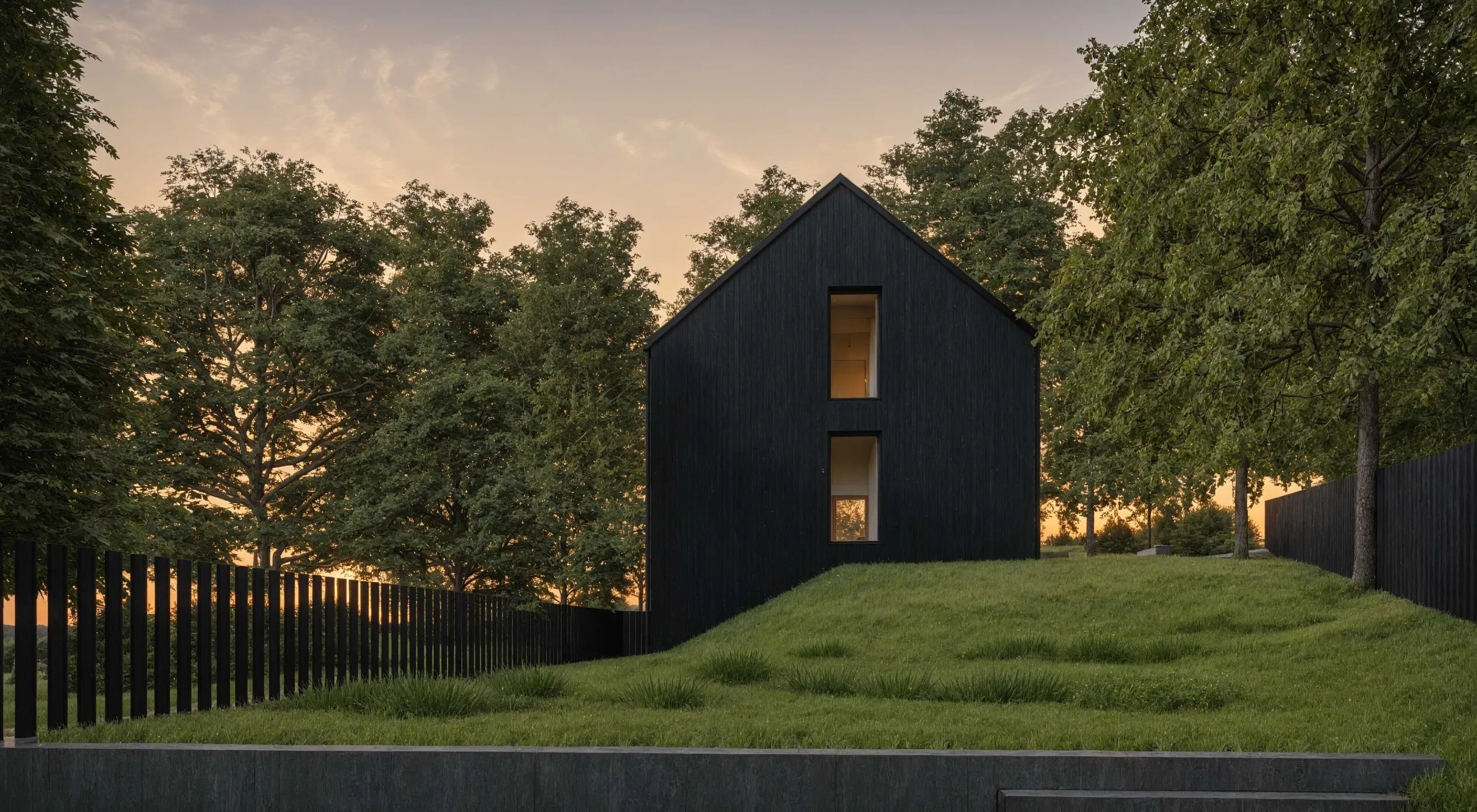 Fasáda z opalovaného dřeva pomáhá stavbě vizuálně zaniknout mezi vzrostlou zelení. Dům se nesnaží dominovat krajině – naopak se vůči ní staví s respektem a nechává ji vyniknout.